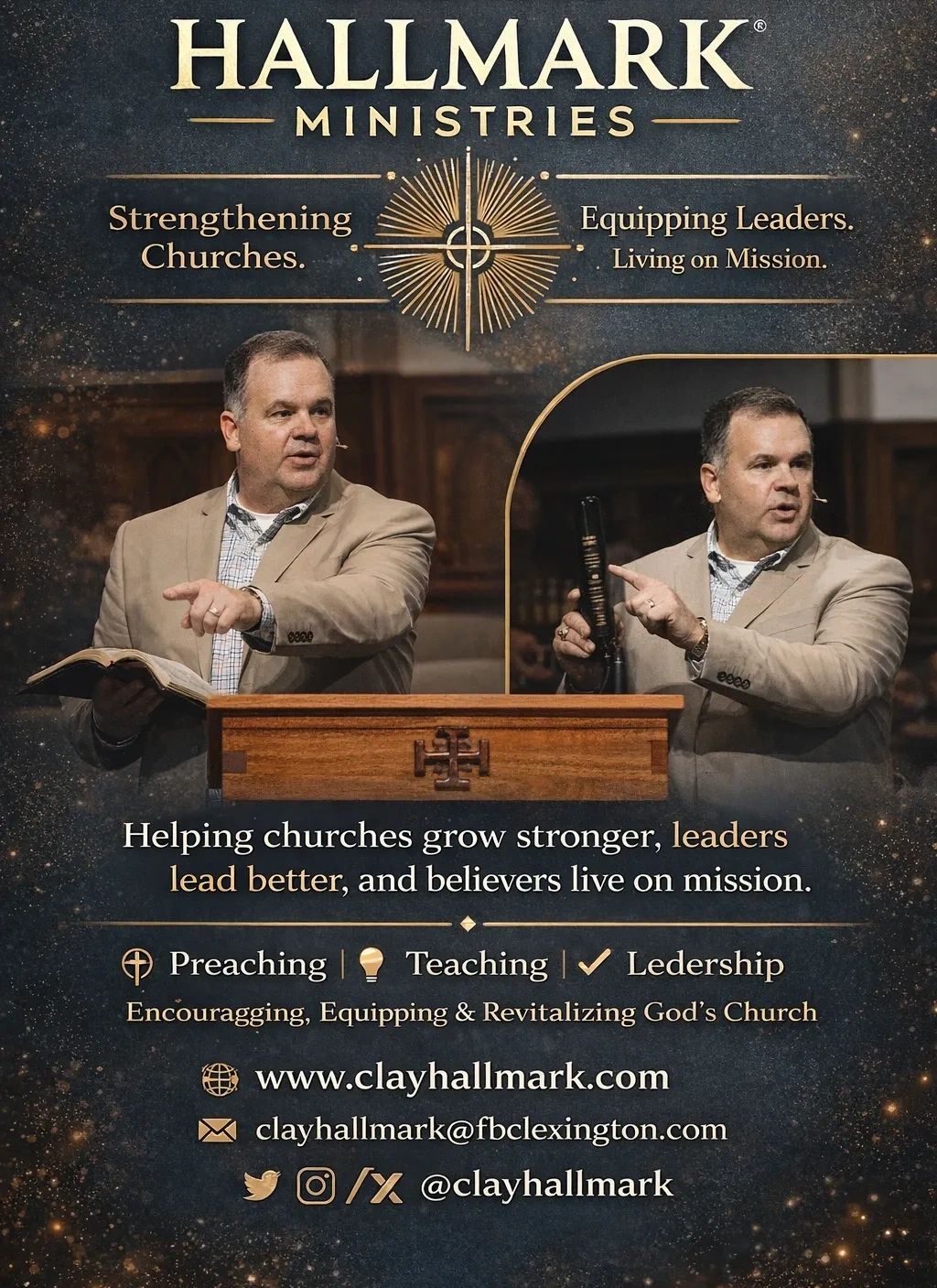 Dr. Clay Hallmark is the Senior Pastor of the First Baptist Church, Lexington, TN. He served as President of the Tennessee Baptist Convention (2021-2023) & the Arkansas Baptist Convention (2009-2011). He and Leslie have two grown daughters, Cassie (Chad) and Kayla (Josh) and two granddaughters (Elizabeth and Natalie).